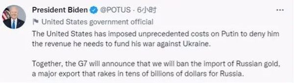 “七国集团将共同宣布,我们将禁止进口俄罗斯黄金。”
