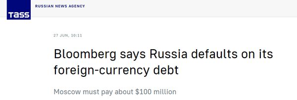 今日“违约”的1亿美元利息,原本应该在5月27日到期。但由于它们的宽限期为30天,所以其实际到期时间为上周日(6月26日)。俄罗斯表示,他们已经履行了偿债等义务。但由于制裁原因,该国被限制通过国际银行系统进行钱款往来,因此资金无法流向海外债权人。