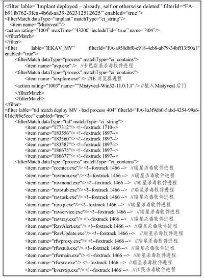 此外,根据“酸狐狸平台”服务器上的过滤器规则片段,可以判断该服务器主要针对中国的主机目标进行攻击,过滤器中重点针对目标环境中的卡巴斯基杀毒软件、瑞星杀毒软件、江民杀毒软件等中国地区流行的杀毒软件进程进行了匹配并进行了可植入条件判断。