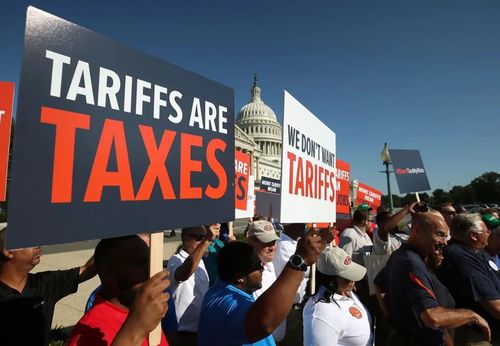 ▲ 2018年7月,美国民众在白宫前高举“关税也是税收”的标语,抗议美国政府征收超过400亿美元的新关税。据经济学家研究,这些关税成本完全由美国公司和消费者负担。