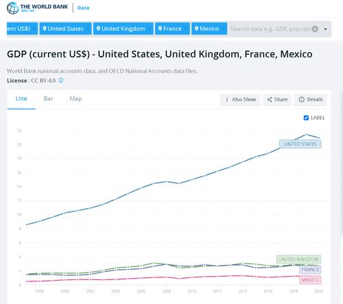 在借鉴网民的这一思路并参考了法新社的套路后,耿直哥想到了一个更有趣的打脸方式。我们在世界银行的系统中,把美国在1997年至2020年间的GDP走势,与法国、英国、墨西哥的同期GDP走势进行了对比,结果发现这些紧紧跟着美国走的欧洲大国、或是紧挨着美国的国家,他们的GDP不仅没有任何显著增加,反而是与美国的大幅增加相比,都显得停滞不前了。他们与美国GDP的比例,亦在这段时间里被越拉越大(如下图所示)。