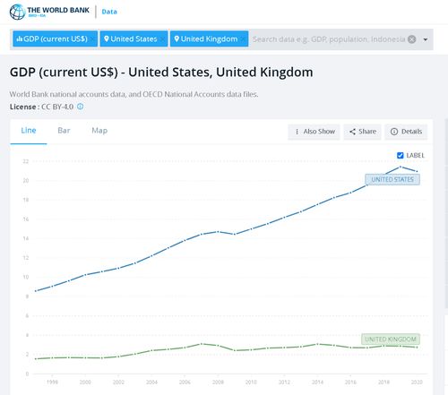 我们又单独选择了英国与美国进行对比,结果发现在1997年时,英国的GDP(约为1.56万亿美元)曾是美国GDP(约为8.58万亿美元)的近20%,为18%。可到了2020年,这个比例却跌到了13%,正不断逼近10%。