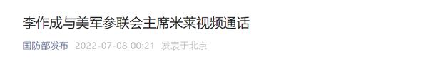 7月7日,中央军委委员、军委联合参谋部参谋长李作成应约与美军参联会主席米莱进行视频通话。