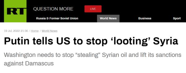 “普京告诉美国停止抢劫叙利亚。”“今日俄罗斯”电视台(RT)以此为题报道称,俄罗斯总统普京当地时间19日在德黑兰与伊朗和土耳其总统会晤后表示,美国必须停止从叙利亚“窃取”石油,并停止通过单边制裁加剧叙利亚人道主义危机。