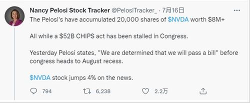 16日:佩洛西已经持有2万股价值超过800万美元的英伟达股票,而芯片法案正被国会搁置。佩洛西昨天表示:“我们决心在国会8月休会前通过这一法案。”消息传出,英伟达股价上涨 4%。