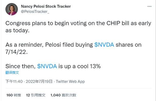 19日:国会计划最早在今天开始对芯片法案进行投票。提醒一下,佩洛西于7月14日提交购买英伟达股票的申请。从那以后,英伟达股价上涨了13%。