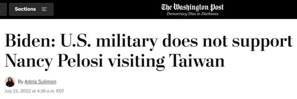 美国总统拜登20日也就“佩洛西访问台湾计划”表态。据美国《国会山报》报道,拜登当天称美国军方对相关报道表示担忧,称“在我看来,军方现在认为这不是一个好主意”。