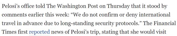 《金融时报》此前爆出“佩洛西计划访问台湾”的消息引起巨大争议后,佩洛西办公室当地时间21日告诉美国《华盛顿邮报》,“鉴于长期的安全协议,我们不会提前确认或否认国际出访行程”。