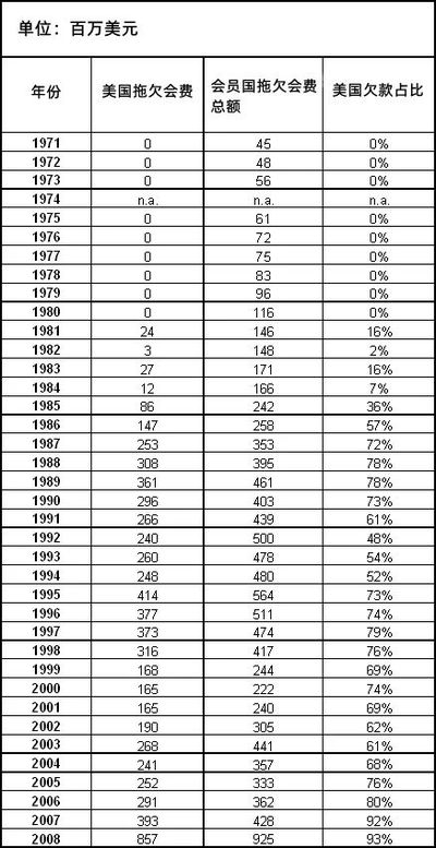 1971-2008美国欠款占全体会员国欠款的比例(截至每年12月31日)图源:全球政策论坛(Global Policy Forum)