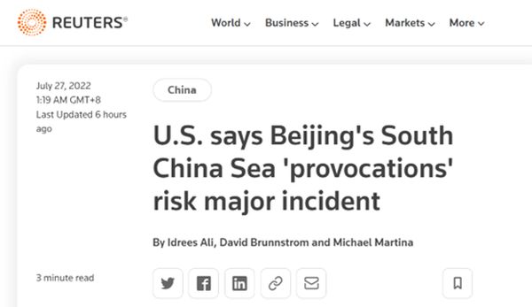 负责印度洋-太平洋安全事务的美国助理国防部长埃利·拉特纳在同一场活动上宣称,今年上半年,与中国军方有关的南海“事件”发生了十几起,“北京正在系统性地试探我们集体决心的极限”。他声称:“在我看来,这种挑衅和不负责任的行为是对当今包括南海在内的地区和平与稳定的最严重威胁之一。如果解放军继续这一行为模式,在该地区发生重大事件或事故只是时间问题。”