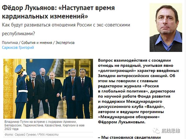 费奥多尔·卢基扬诺夫:没有人打算建立任何“苏维埃式”的联盟,这不可能,也没任何必要。苏联解体三十年后,俄罗斯以及所有“后苏联空间”的国家站在了时代的门槛上,跨过这个门槛,国家便开始进入全新的时代。