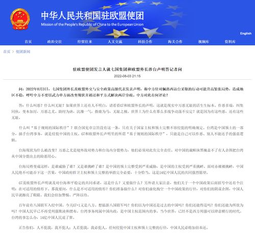 8月3日,七国集团外长及欧盟外交与安全政策高级代表发表声明,称中方针对佩洛西访台采取的行动可能升高紧张局势,造成地区不稳,呼吁中方不要以武力单方面改变现状并通过和平方式解决两岸分歧。