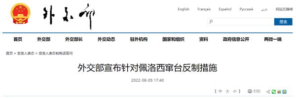针对美国国会众议长佩洛西不顾中方强烈反对和严正交涉,执意窜访中国台湾地区,外交部8月5日宣布采取以下反制措施:一、取消安排中美两军战区领导通话。……