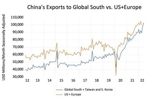 中国对非欧美国家(南方国家)加台湾地区、韩国的出口总额已经赶上对美欧的出口总额了