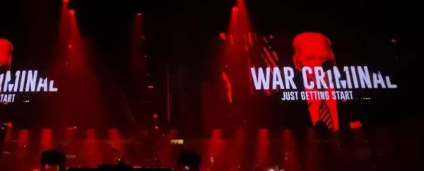 沃特斯巡演屏幕上,挂上拜登“战争犯”的画面 视频截图