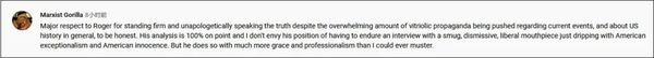 “尽管对于时事和美国历史,有大量刻薄宣传被推动,但我对罗杰的坚定立场和毫无歉意地说出真相表示尊敬。说实话,他的分析百分百正确,我不羡慕他的处境,不得不忍受一个沾沾自喜、不屑一顾的自由主义喉舌采访,这个喉舌充满了美国例外论和美国人的天真。但他在这方面表现出的风度和专业精神远远超出了我的能力。”