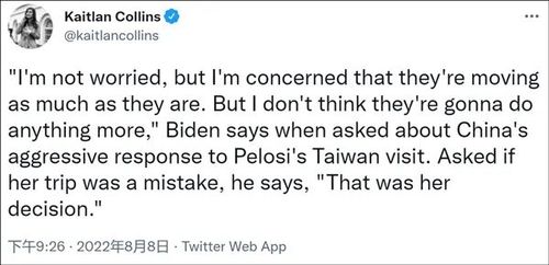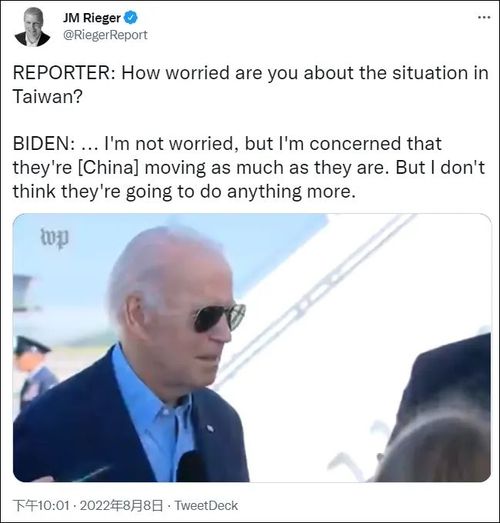 拜登回答,自己并不担心(台湾),而是担忧美国众议院议长佩洛西窜访台湾后大陆近期举行的多轮军事演训。