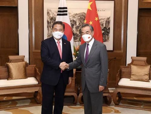 2022年8月9日,国务委员兼外长王毅在山东青岛同来华访问的韩国外长朴振举行会谈。图源:外交部网站