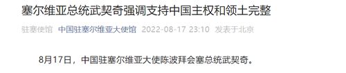 塞尔维亚总统武契奇强调支持中国主权和领土完整8月17日,中国驻塞尔维亚大使陈波拜会塞总统武契奇。武契奇积极评价两国关系并强调,……