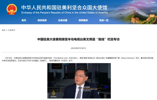 8月16日,中国驻美大使秦刚接受半岛电视台英文频道“底线”(The Bottom Line)栏目主持人、美国“旗语”新闻社及《国会山报》特邀编辑克莱门斯(Steve Clemons)专访,重点就台湾问题、中美关系回答提问。采访内容已于8月18日播出(有删节),现场完整实录(中译文)如下: