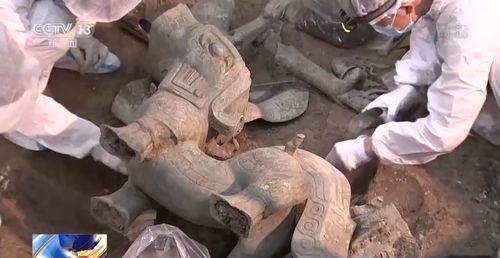 另据四川观察报道,8月24日下午,四川广汉三星堆遗址8号祭祀坑成功提取出一件大型立人神兽,是截至目前三星堆出土众多动物造型青铜器中最大的一件!