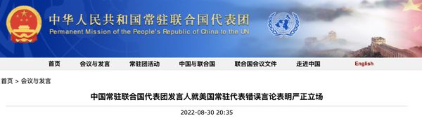 8月30日,中国常驻联合国代表团发言人就美国常驻代表错误言论表明严正立场,全文如下: