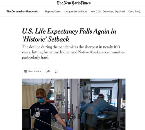 从《纽约时报》的报道来看,这组数据是美国国家卫生统计中心统计发布的。该中心发现2021年美国的人均预期寿命已经跌到了76岁,比2019岁时的79岁足足缩短了3年,是自上世纪20年代以来美国人均预期寿命的最大跌幅。