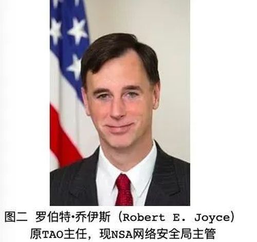 而当时TAO负责人是罗伯特·乔伊斯。此人1967年9月13日出生,曾就读于汉尼拔高中,1989年毕业于克拉克森大学,获学士学位,1993年毕业于约翰·霍普金斯大学,获硕士学位。1989年进入美国国家安全局工作。曾经担任过TAO副主任,2013年至2017年担任TAO主任。2017年10月开始担任代理美国国土安全顾问。2018年4月至5月,担任美国白宫国务安全顾问,后回到NSA担任美国国家安全局局长网络安全战略高级顾问,现担任NSA网络安全局主管。