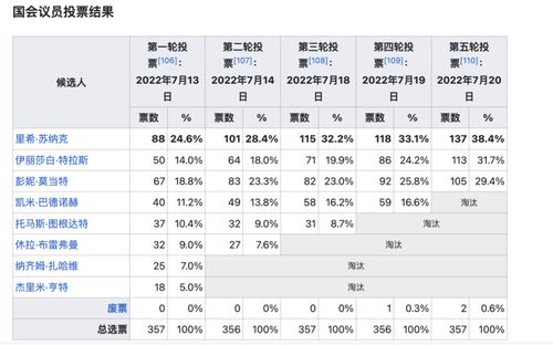 在随后的投票中,特拉斯的排名经常处在危险位置:在7月13日首轮投票,357张选票中她仅获得50张,远远落后于苏纳克的88张和莫当特的67张,仅领先身后的巴德诺奇(Kemi Badenoch,地方政府、信仰和社区国务大臣)10张;第二轮她选票增至64张,但苏纳克和莫当特分别增至101张和83张。
