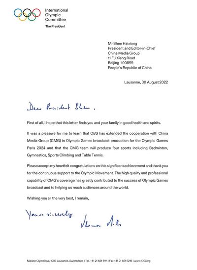 签约仪式上宣读了国际奥委会主席巴赫的贺信。在给中国中央广播电视总台台长慎海雄的亲笔信函中,巴赫对总台与奥林匹克转播服务公司就2024年巴黎奥运会的公用信号制作拓宽扩大合作表示衷心祝贺。巴赫指出,总台报道的高质量和专业能力,对奥运会的成功转播作出了巨大贡献,并帮助奥运会触及到全世界各地的观众。