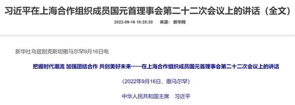 文章导读 把握时代潮流 加强团结合作 共创美好未来——在上海合作组织成员国元首理事会第二十二次会议上的讲话(2022年9月16日,撒马尔罕)中华人民共和国主席……