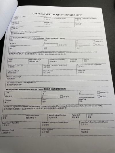 图:记者获得的一份《海外背景调查问卷》(Overseas Vetting Questionnaire)复印件