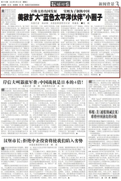 “美国之音”援引分析人士的话称,“蓝色太平洋伙伴”的成立是制衡中国在南太平洋地区外交和军事影响力上升的一系列最新举措之一。该组织成立时白宫曾发表声明,称五国将在这一框架下密切合作,来应对“基于规则的自由开放国际秩序承压上升”等挑战,并同太平洋岛国在气候变化、海上安全、卫生等领域开展合作。《读卖新闻》20日分析称,日美英澳新旨在通过经济援助来牵制在太平洋岛国不断增强影响力的中国,并希望通过扩大这一合作框架进一步强化对华包围网。
