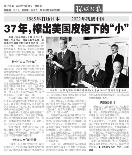 香港《南华早报》9月18日文章,原题:先是日本,现在轮到了中国:美国再次诉诸经济打压对手的战术 1985年9月22日,当时的五国集团财长们在纽约签订了广场协议,美元兑日元和欧洲主要货币的汇率大幅贬值。自此之后,美国对于这种打压对手的战术乐此不疲。