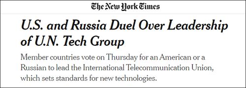《纽约时报》称,美国和俄罗斯正在争夺一个为新技术制定标准的联合国机构的主导权。报道还声称,这是所谓“民主国家”和“专制国家”之间全球斗争的一部分,关乎“互联网发展的方向”。