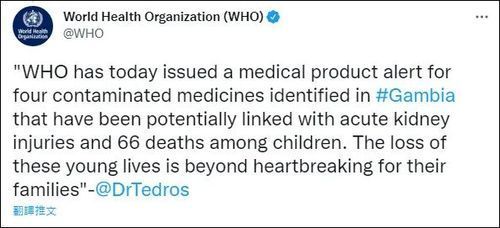 世卫组织总干事谭德塞5日表示,上述药品可能与冈比亚近期出现的儿童急性肾损伤及66例死亡案例有关,“这些年轻生命的逝去让他们的家人无比心碎”。