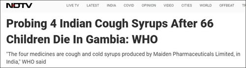 据新德里电视台报道,四种产品分别是异丙嗪口服液、Kofexmalin婴儿止咳糖浆、Makoff婴儿止咳糖浆和Magrip N感冒糖浆,皆来自印度制药公司Maiden Pharmaceuticals。世卫组织表示,该制药公司迄今为止尚未就其产品的安全性和质量向世卫组织提供保证。