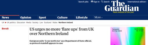 关于“北爱尔兰议定书”,《卫报》称,在该协议上的冲突与争执,一度让英国与爱尔兰、英国与欧洲的关系破裂,也在英美两国这一“特殊关系”上蒙上阴影。白宫新闻秘书让-皮埃尔9月7日曾表示,任何破坏“北爱尔兰议定书”的尝试都不会为美国和英国之间的贸易谈判创造有利的环境。