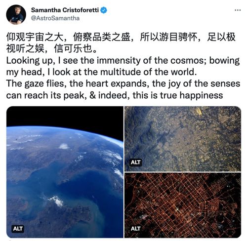 正在国际空间站上执行驻留任务的意大利首位女性航天员萨曼莎·克里斯托福雷蒂,10月12日在太空中“书写”了一段中国式浪漫。当天,她在个人推特账号上发布了一组太空摄影作品,并配上一句描写宇宙景观的中国古文,既展现太空视角下的家园之美,又展现自己不俗的中文功底。航天专家12日在接受《环球时报》记者采访时表示,虽然萨曼莎·克里斯托福雷蒂此前就展露出色的中文水平,但此次能够熟练借用这句中国古文还是令人感到吃惊。