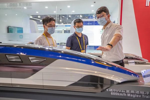 ▲资料图片:8月22日,在2022智博会中国中车展厅,工作人员向嘉宾介绍时速600公里高速磁悬浮交通系统。(新华社发)