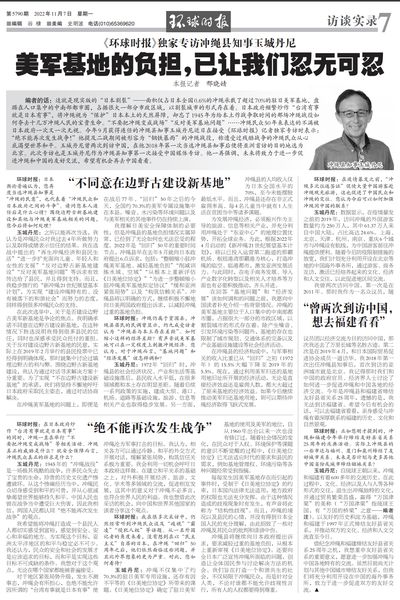 我理解日美安全保障体制的必要性,但是冲绳县的基地负担情况实属异常,已经到了无论如何也无法忍受的程度。2022年是“回归”50年的重要时间节点,冲绳县早在去年5月就向日本政府提出6点诉求,包括:“整顿缩小驻冲绳美军基地、减轻基地负担”“削减训练水域、空域”“从根本上重新评估《日美地位协定》”“为进一步整顿缩小驻冲绳美军基地拟定协议”“缓和亚洲紧张局势”以及“构筑信赖关系”。冲绳县将以明确的方式,继续积极不懈地向日美两国政府提出诉求,以减轻冲绳过重的基地负担。