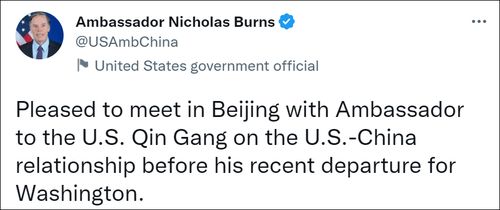 “很高兴在驻美大使秦刚即将启程前往华盛顿之前,在北京与他就美中关系进行会晤”,伯恩斯在推特上写道,并附上两人的合影。