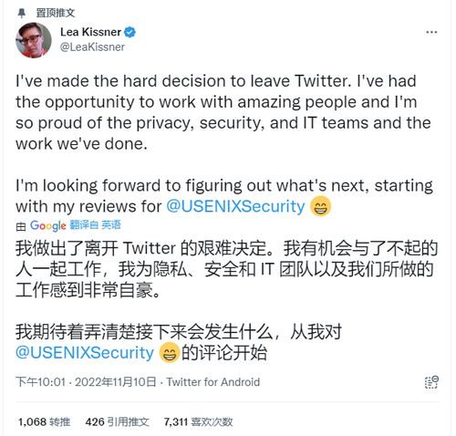 推特首席信息安全官李·吉斯那(Lea Kissner)当地时间周四在推特上宣布离职。根据路透社获悉的内部消息,首席隐私官戴米尔·基尔兰(Damien Kieran)和首席合规官玛丽安妮·傅高提(Marianne Fogarty)也已辞职。