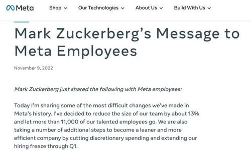 他在邮件一开头就“满怀歉意”地宣布,META决定裁员大约13%,超过1.1万名员工将会离开。