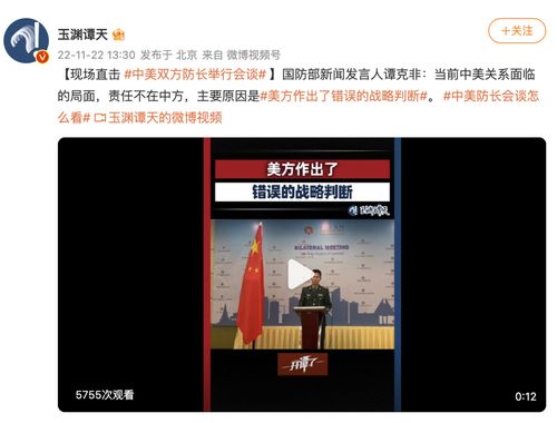22日上午,中国国务委员兼国防部长魏凤和上将应约与美国国防部长奥斯汀在柬埔寨举行会谈。会谈结束后,中国国防部新闻发言人谭克非在柬埔寨举行的记者吹风会上表示,此次会谈是落实两国元首会晤重要共识的实际举措,对推动两军关系重回健康、稳定发展的正确轨道具有十分重要的意义。
