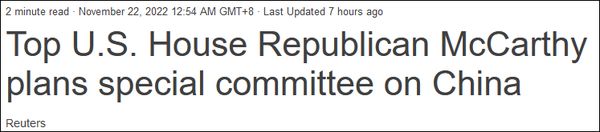 路透社:众议院共和党领袖麦卡锡打算成立中国问题特别委员会
