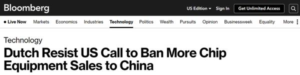 彭博社报道:美国呼吁禁止向中国出售更多芯片设备,荷兰抵制。