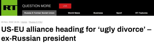 RT:俄罗斯前总统称,美欧联盟正走向“难堪的分手”