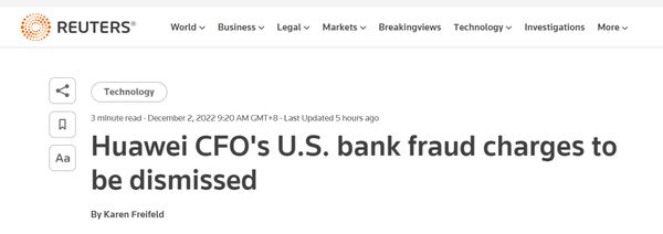 报道提到,孟晚舟去年与美国司法部达成协议,后者将于2022年12月1日撤销对她的指控,也就是她被加拿大“应美方要求”为由逮捕的整整四年之后。