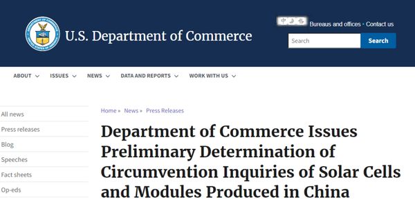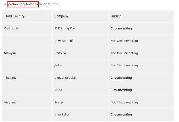 “此类行为相当于试图逃避对来自中国的太阳能电池和组件征收的现有反倾销税(AD)和反补贴税(CVD)命令。”美国商务部还声称,这些行为损害了美国工业行业。但谈及初步裁定结果,该局强调,这并不意味着“进口禁令”,有关公司仍有机会证明其不存在规避行为。